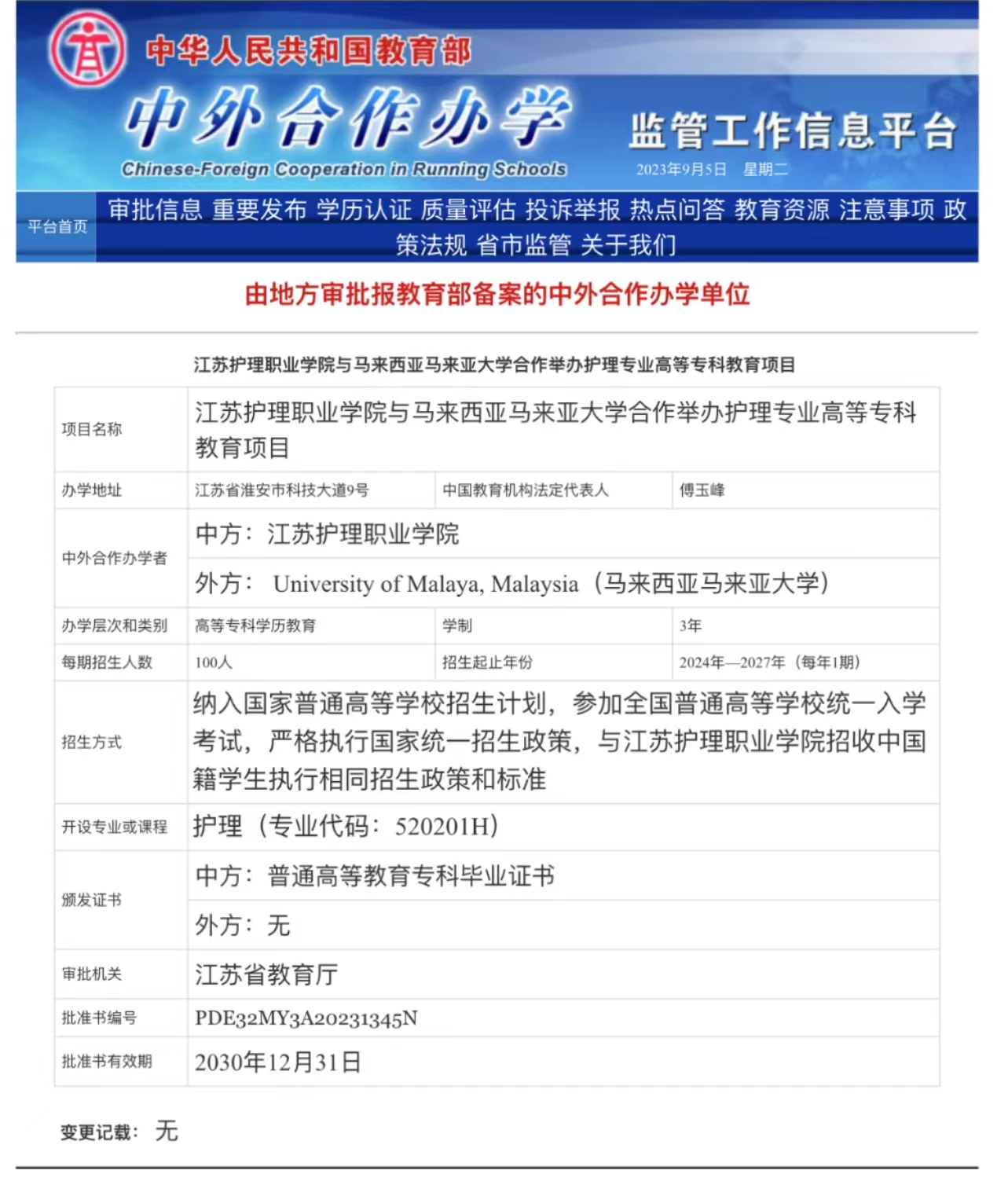 近日,教育部中外合作办学监管工作信息平台发布,beat365与马来西亚马来亚大学合作举办护理专业高等专科教育项目获批。这也是beat365首个经江苏省教育厅审批、教育部备案的中外合作办学项目。