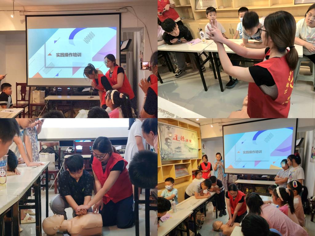 整个活动分别从理论知识讲解、急救技能演示、实际操作三个阶段进行。首先林鑫怡同学通过PPT以图文并茂的形式进行急救知识讲解,紧接着李晓雅同学使用人体模型对心肺复苏(CPR)、海姆立克急救法等进行演示,讲解完要领后参加活动的小朋友上台模拟实际急救情况,以及应对心脏骤停、气道异物梗阻和中暑等紧急情况的处理方法等等。活动现场,小朋友们表现出了极大的兴趣和参与度,他们积极提问,互相分享急救知识,在志愿者的耐心指导和反复练习下,小朋友们逐渐掌握了基本的急救技能。