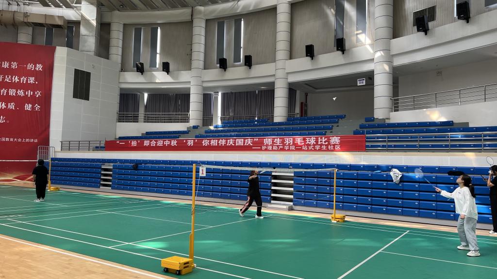 为营造和谐欢快的节日氛围,护理助产学院“一站式”学生社区于9月30日在校体育馆三楼举办“一‘拍’即合迎中秋 ‘羽’你相伴庆国庆”师生羽毛球比赛,共4支参赛队伍参加比赛。