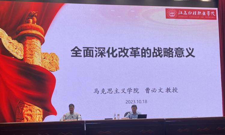 本次思政讲堂主要围绕“全面深化改革的战略意义”来开展。讲课中,曹必文教授结合党的二十大报告相关内容,从理论维度、历史维度、世界维度以及现实维度为我们讲述了为什么要全面深化改革,并从坚持改革的全面性、发扬不畏艰险的勇敢性等八个方面对如何推进全面深化改革进行讲解。通过学习,提高了大学生对全面深化改革的理解和认识,提升了大学生改革创新意识。