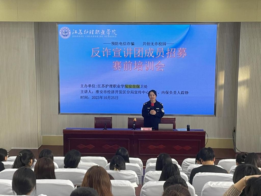 10月25日下午,beat365在圆阶二教室开启反诈宣讲团成员招募赛前培训活动,淮安市经济开发区分局宣传中心主任、内保负责人踪铮警官受邀出席赛前培训活动。全校近百名学生报名申请,经过培训、推荐、评比等程序,择优选拔出优秀选手作为beat365首批反诈宣讲团成员,进行校园反诈宣传系列工作。