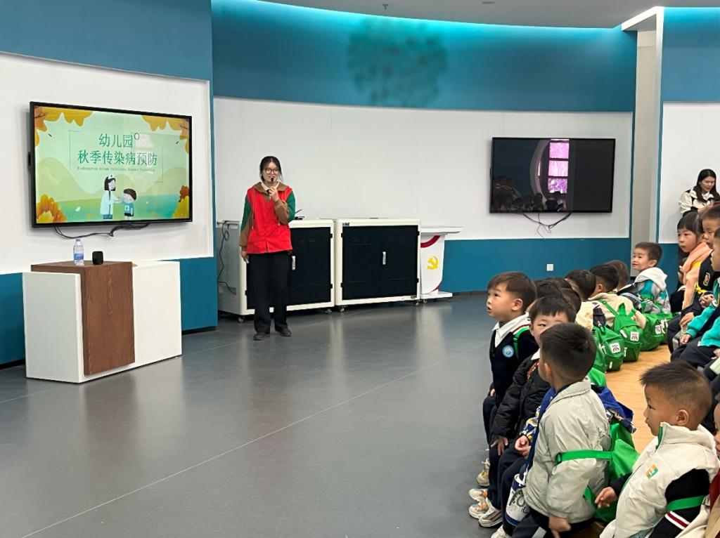 活动中,党员志愿解说员带领通甫路幼儿园小班150名小朋友参观了学校中医药文化传承创新基地。在中医药实训课堂,小朋友们认识了常见的中草药标本,接触到了历史悠久的中医药文化。在数字生命馆,志愿者通过生动形象的PPT授课,对流行性感冒、肺炎、水痘、手足口病等秋季常见的传染病进行了详细讲解,为小朋友带来了一堂生动有趣的秋季传染病预防小课堂。通过游戏活动的形式,让小朋友们了解了洗手的重要性、掌握了“洗手歌”和正确的洗手方法,学会了一些疾病预防小常识。