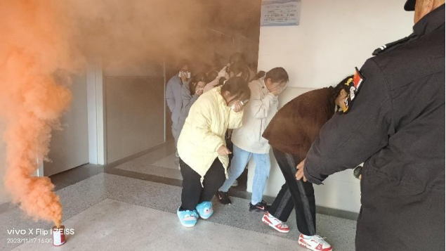 本次演练分两个阶段实施。首先开展火灾疏散逃生。演练开始前消防员给学生们讲解了火灾疏散逃生要领,避免学生们在逃生过程中发生意外事故。下午4点整,随着警报声响起,同学们在指挥下按照指定路线,用手、毛巾捂住口鼻从1号楼5楼迅速有序进行紧急疏散。疏散结束后,姬如松对活动进行了讲评总结。