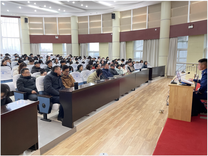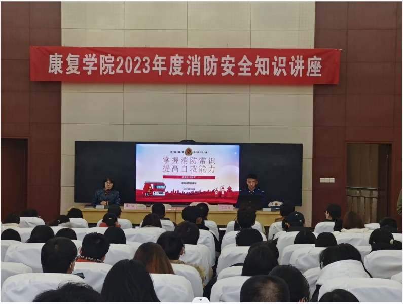 12月13日下午,在黄河路校区第二报告厅,淮安市城南消防救援站梁德成班长应邀到场为全体师生开展以“掌握消防常识,提高自救能力”为主题的消防安全知识专题讲座。学院班子成员及全体教职工、学生代表参加讲座,党委安全保卫部部长姬如松及部门成员应邀参加讲座。讲座由康复学院院长薛彩萍主持。