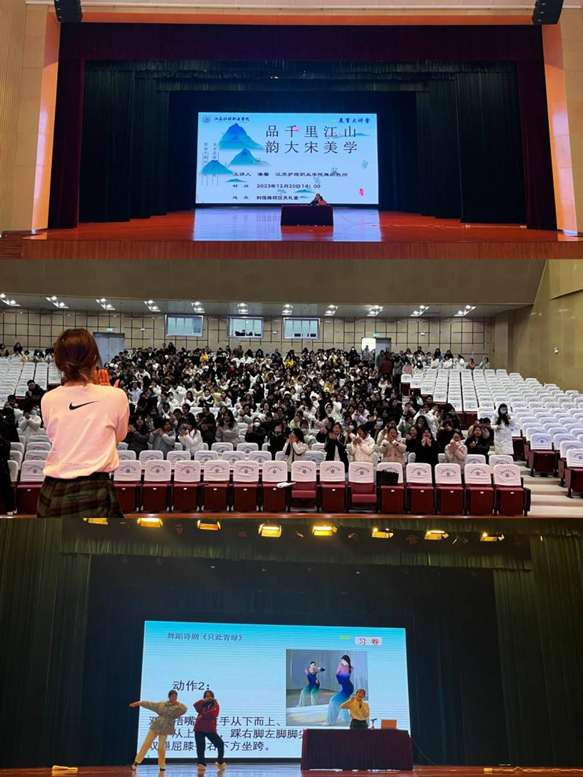 为将美育融入学生校园文化生活,拓宽学生艺术视野,公共基础部于2023年12月20日在科技路校区大礼堂举办了“美育大讲堂”系列讲座之《品千里江山,韵大宋美学》。讲座由公共基础部舞蹈教师潘馨主讲。