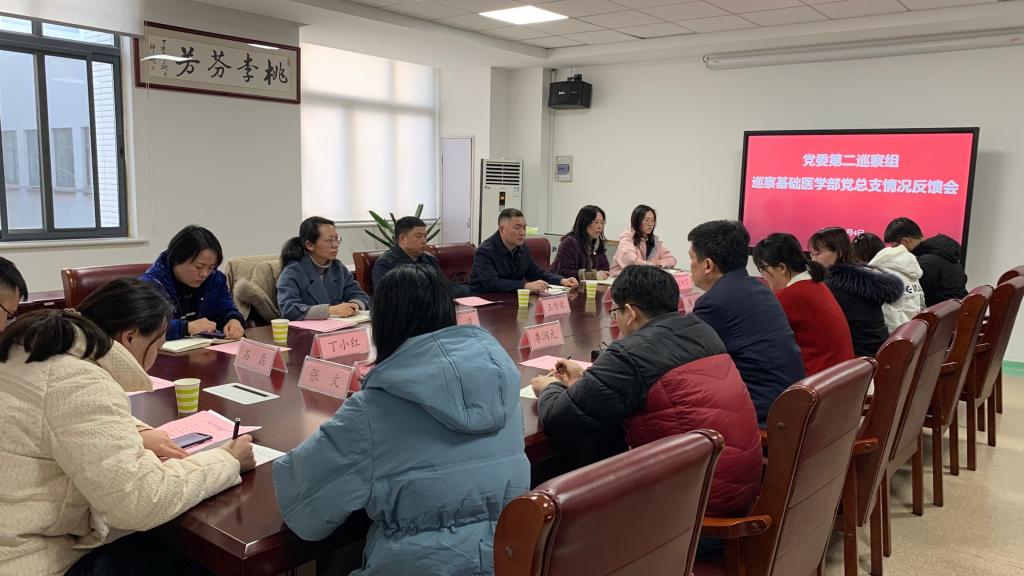 根据学校党委巡察工作领导小组工作部署,2024年1月4日下午,党委第二巡察组在 1号实训楼213会议室召开巡察基础医学部党总支情况反馈会。党委第二巡察组组长朱郁草代表巡察组分别向基础医学部党总支书记梁珣及班子成员反馈巡察意见,对基础医学部党总支抓好巡察整改工作提出要求,梁珣代表班子成员作表态发言。学校党委巡察工作领导小组副组长、纪委书记王传荣,第二巡察组全体成员,基础医学部全体教职工参加会议。