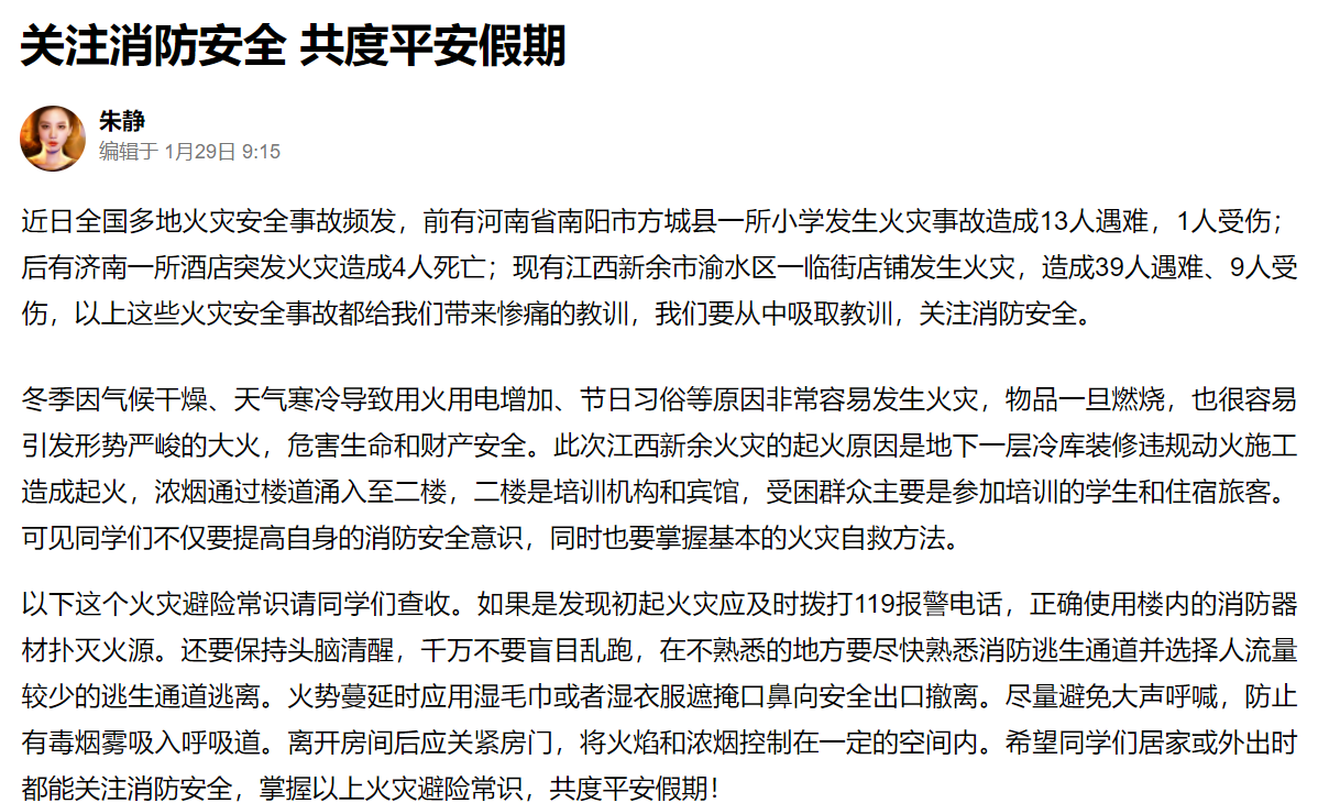 筑牢安全防线,护航平安春节。冬季天干物燥,是火灾事故的高发季节,临近春节,用火用电用气增多,结合近期新余“1·24”火灾事故,康复学院就假期防火用电安全发布了学生寒假安全提示,并开展线上主题班会,扎实筑牢安全防线。1月30日下午,康复学院团总支联合营中社区对沿街商铺开展安全生产宣传,还特别针对辖区独居老人、孤寡老人、残疾人等重点人群进行一对一入户安全隐患排查,细心讲解冬季防火防气安全知识,张贴安全提示条,提醒老人注意用水用电用气安全,营造安全过节的浓厚氛围。