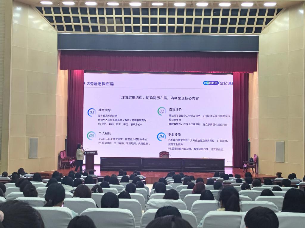 全忆健康产业集团的校园招聘负责人为同学们带来了精彩的就业指导讲座。负责人结合企业的发展现状和行业需求,分享了当前就业市场的趋势和简历制作技巧,为同学们未来的求职之路指明了方向。宣讲结束后,不少同学带着自己的简历前往教学楼进行面试,就岗位要求等问题与企业员工进行深入交流,增进了对行业的了解,也拓展了就业选择的视野。
