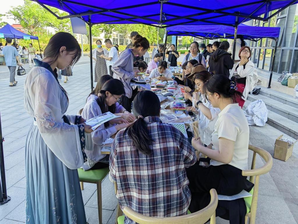 在传统文化活动区,古色古香的氛围让人仿佛穿越回了古代。大学生们在这里可以亲身体验传统技艺,如京剧脸谱绘制、中国结手工DIY、漆扇、约绘纸鸢、织布造物、手绣之美、植物拓印、画石膏娃娃等。同学们在各摊位前流连忘返,跃跃欲试都想要参与,体验亲手DIY的乐趣,正在参与的同学神情专注地学习着各种手法技巧,不一会儿,一份份精美的作品便在她们手中诞生;刺绣摊位前,同学们安静的飞针走线,绣出心中的宁静与感悟;拓印、绘制区则充满了创意与想象,一幅幅展现大学生独特视角的作品跃然呈现。传统文化的魅力在这个区域尽情绽放,为大学生们带来了一场心灵的滋养。