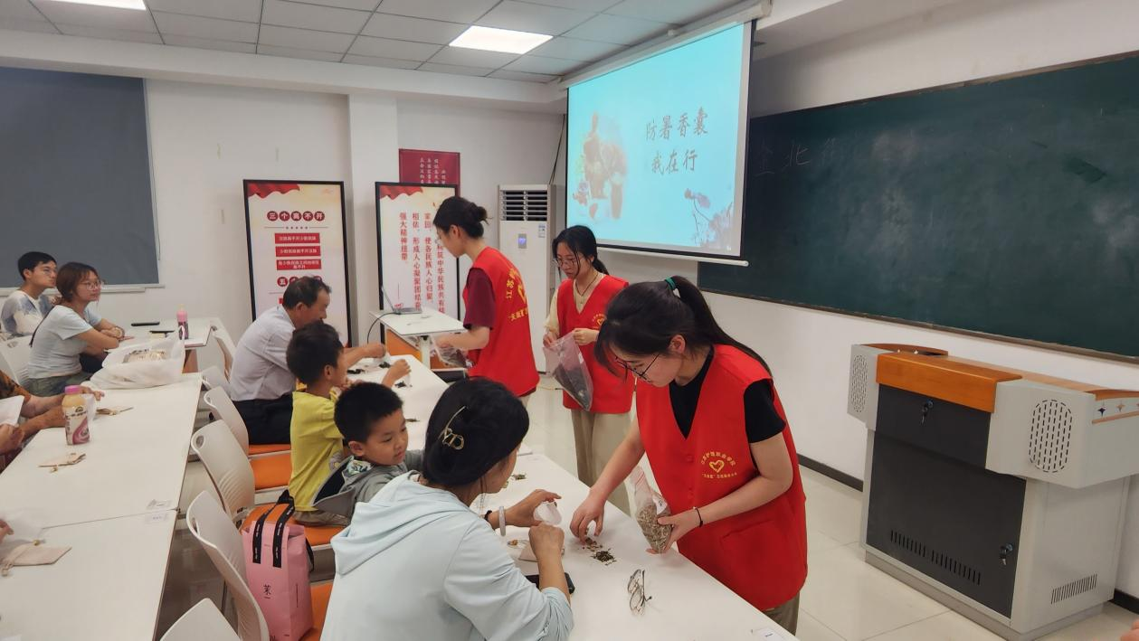 2024年7月10日,全国大学生中医药文化志愿宣讲团beat365中国官方网站“天南星”志愿服务大队来到淮安市金湖县金港中心村党群服务中心,开展“中医防暑小妙招”主题志愿服务活动,运用所学专业知识给当地居民带来一堂别开生面的中草药小课堂。通过讲述中医药小故事、中医防暑小妙招和制作中药香囊等活动,让基层群众切实感受到中医药文化的独特魅力。