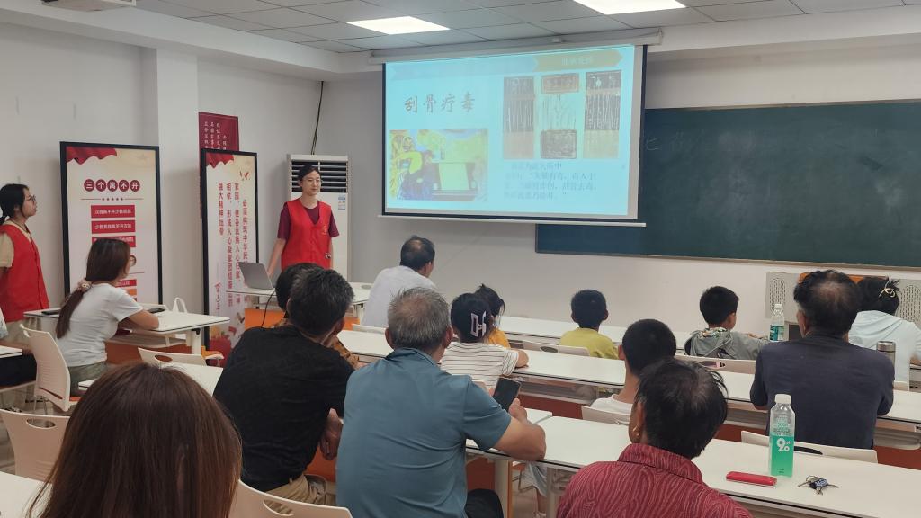 活动中,志愿者王雨若面向小朋友们开展“以青春热爱 点亮中医药传承薪火”主题宣讲,通过生动的语言带领大家穿梭于历史的长河中,了解中医药的突出贡献。