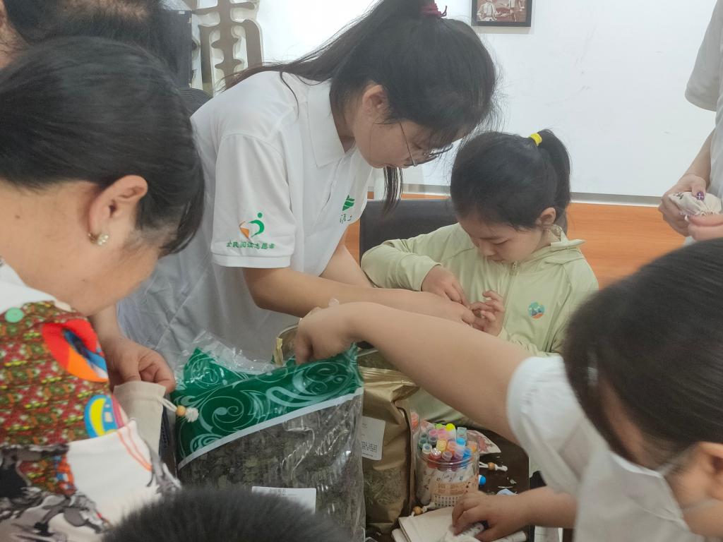 扬中华国粹,传中医文化。志愿者们结合专业所长,讲述中医药知识,带领现场的小朋友了解中医药文化,向家长普及儿童用药的相关知识和注意事项,帮助他们纠正错误的用药观念,提高用药的科学性和安全性。时值盛夏,志愿者还为小朋友们准备了制作驱蚊香囊的紫苏、艾叶、丁香、藿香等药材,手把手指导他们完成装袋,现场氛围其乐融融。