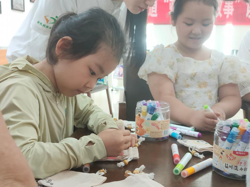 小手绘明天,童心快乐梦。志愿者们介绍了香囊的历史和文化意义,小朋友们听得津津有味,在志愿者的引导下,他们结合阅读过的书目,拿起画笔,小心翼翼地在香囊上进行绘画创作,勾勒出各种图案,制作出属于自己的“独家记忆”。每一个香囊都展现了小朋友们独特的想象力和艺术才华,他们用五彩斑斓的颜色填充着图案,让香囊变得更加生动有趣。