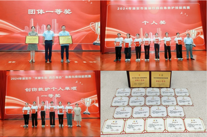 教师选手张静荣获“心肺复苏单项一等奖”“创伤救护单项一等奖”,并因其出色表现被授予“市五一创新能手”“市技术能手”及“淮安市红十字应急救护能手”等荣誉称号。