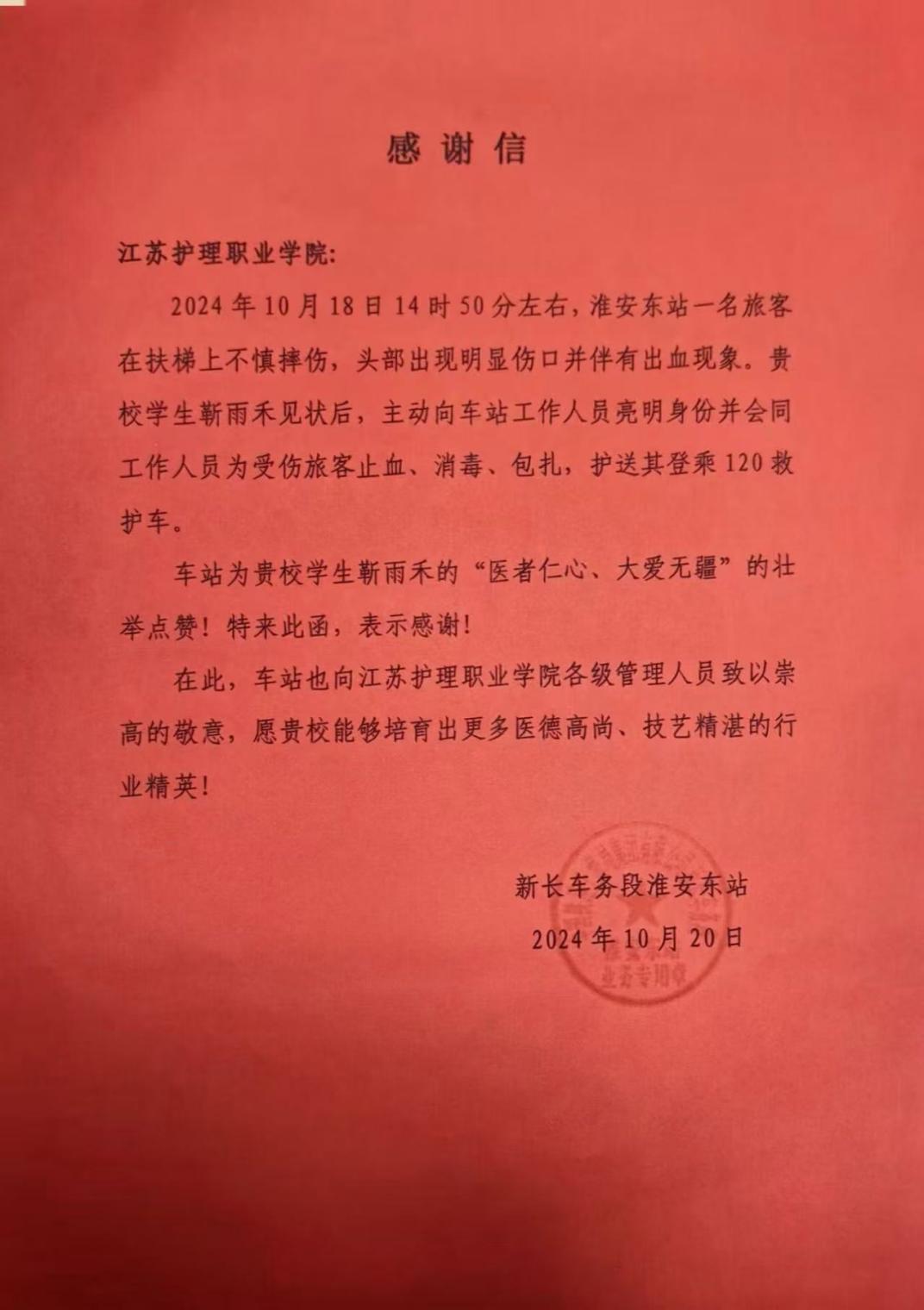 急救先锋,护航生命。靳雨禾同学在面对紧急情况时,挺身而出,积极施救,展现出我院学生医者仁心、敢于担当的精神,是“敬佑生命、救死扶伤、甘于奉献、大爱无疆”的生动体现。她的行为得到了新长车务段淮安东站的肯定与赞扬。
