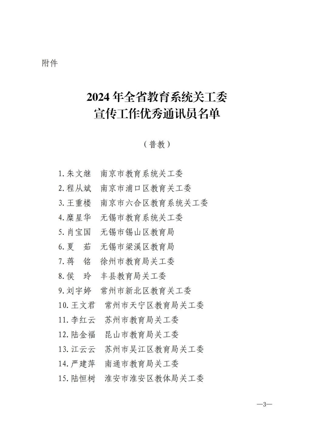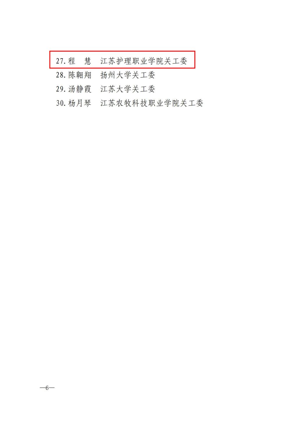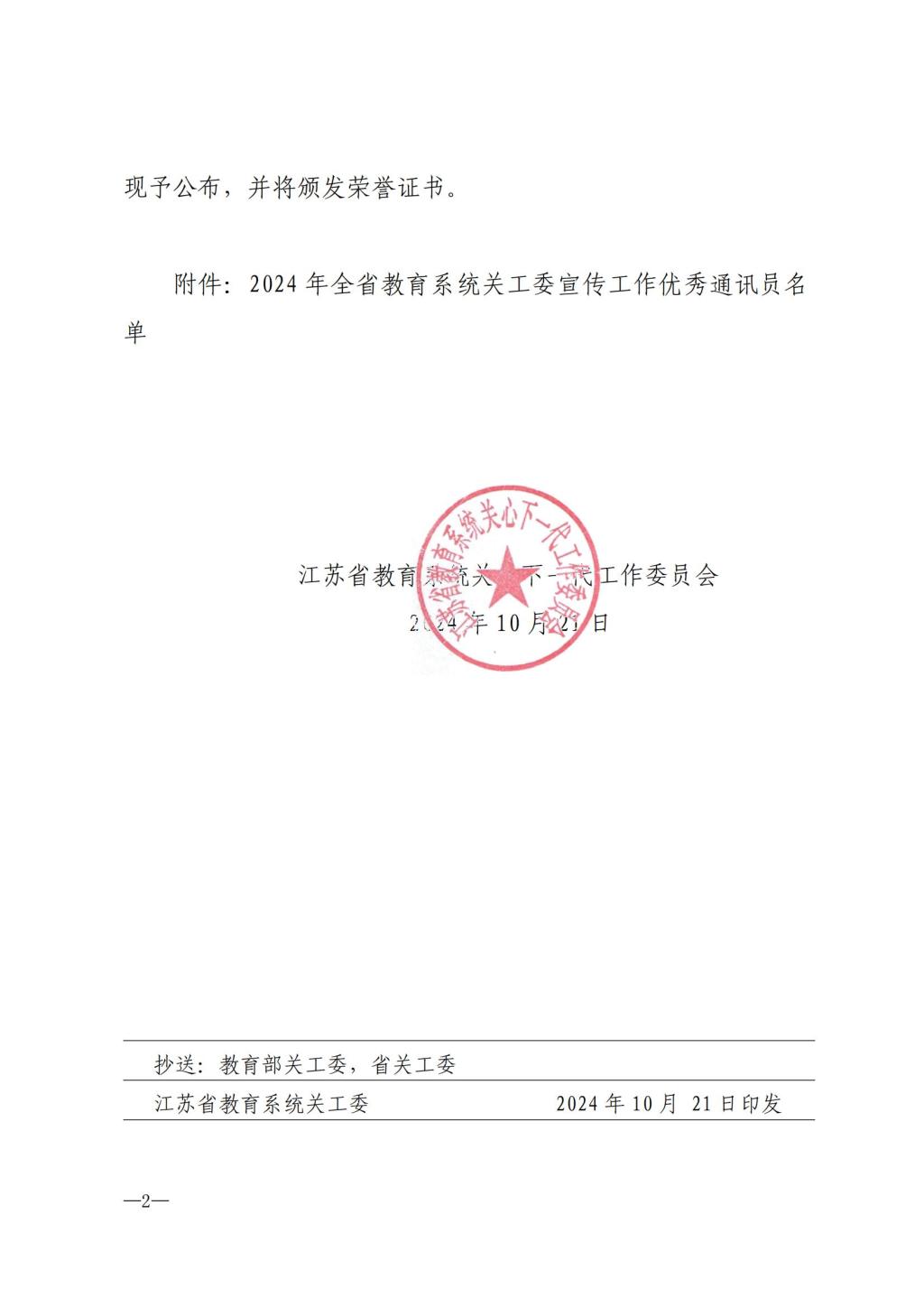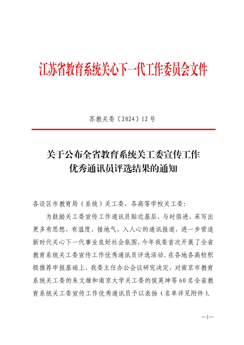 根据《关于公布全省教育系统关工委宣传工作优秀通讯员评选结果的通知》(苏教关委〔2024〕12号)公示结果获悉,beat365程慧老师获评全省教育系统关工委宣传工作优秀通讯员,本次共有11位高职院校人选获评。学校关工委高度重视宣传报道工作,多次组织开展通讯员培训班,积极宣传工作中的好做法、好经验、好典型,着力推动关心下一代工作高质量发展。