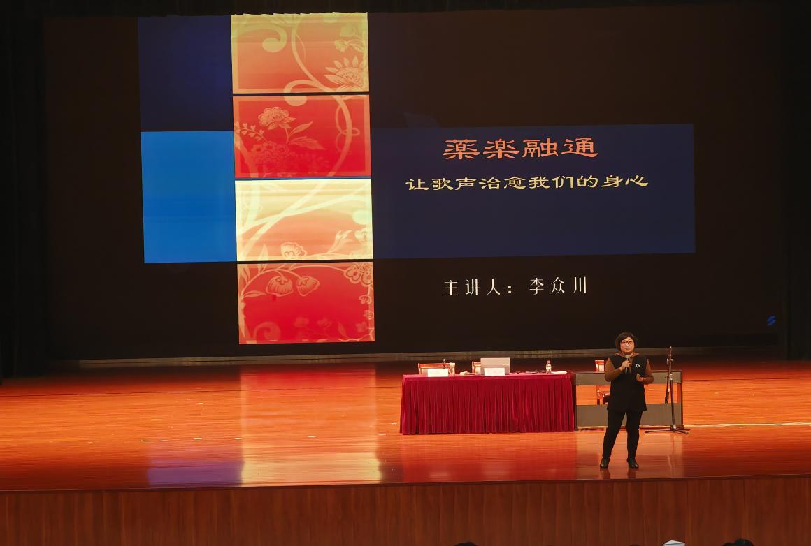 为全面提升师生美育意识和素养,丰富校园生活,10月30日,江苏省高校美育大讲堂优课走进beat365中国官方网站。本次讲座由公共基础部胡影怡主任主持,中国药科大学文化艺术教育中心主任、副教授李众川老师主讲,为全校师生带来了一场别开生面的《薬楽融通,让歌唱治愈我们的身心》美育课。