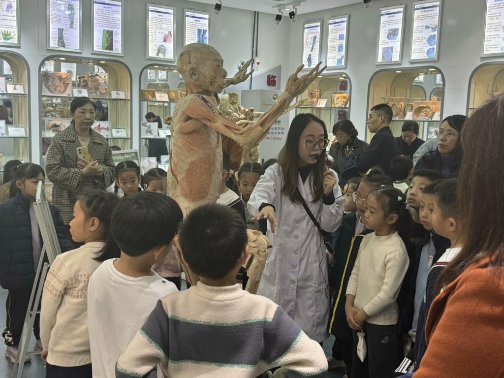 在人体生命科学馆,小朋友们首先参观了“胚胎展区”,医学基础部林婷老师通过讲解了各个时间段的胚胎标本,使同学们直观地了解胚胎发育的全过程,体会到生命的伟大及母亲孕育的艰辛。在九大系统展区,林老师向小朋友介绍了人体体腔内肝、心、脾、肺、肾等多个脏器的关系和机体的运作机制,进一步探索了生命的奥秘。