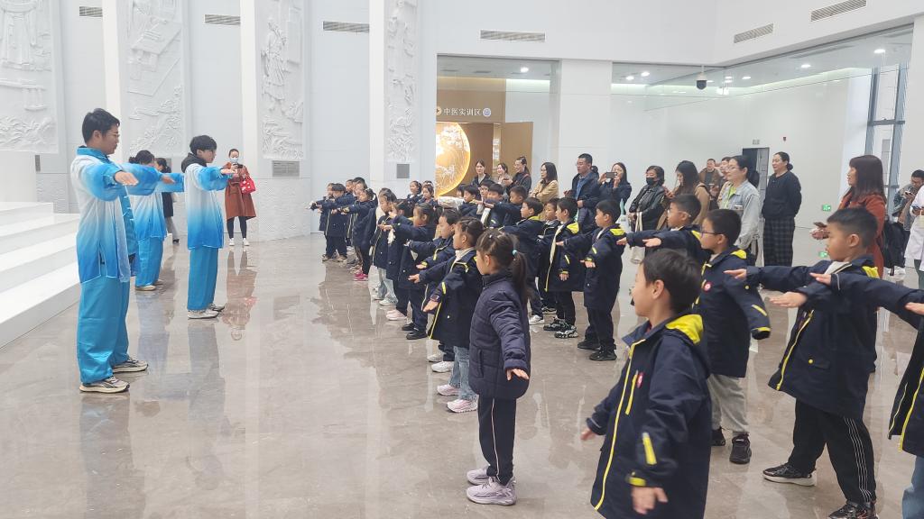 随后,淮安市实验小学的同学还和志愿者们一起练习健身气功易经筋。在志愿者们耐心的指导下,小朋友们逐渐掌握了一些基本的姿势,他们努力地伸展肢体、调整呼吸,大厅里充满了童真的活力。