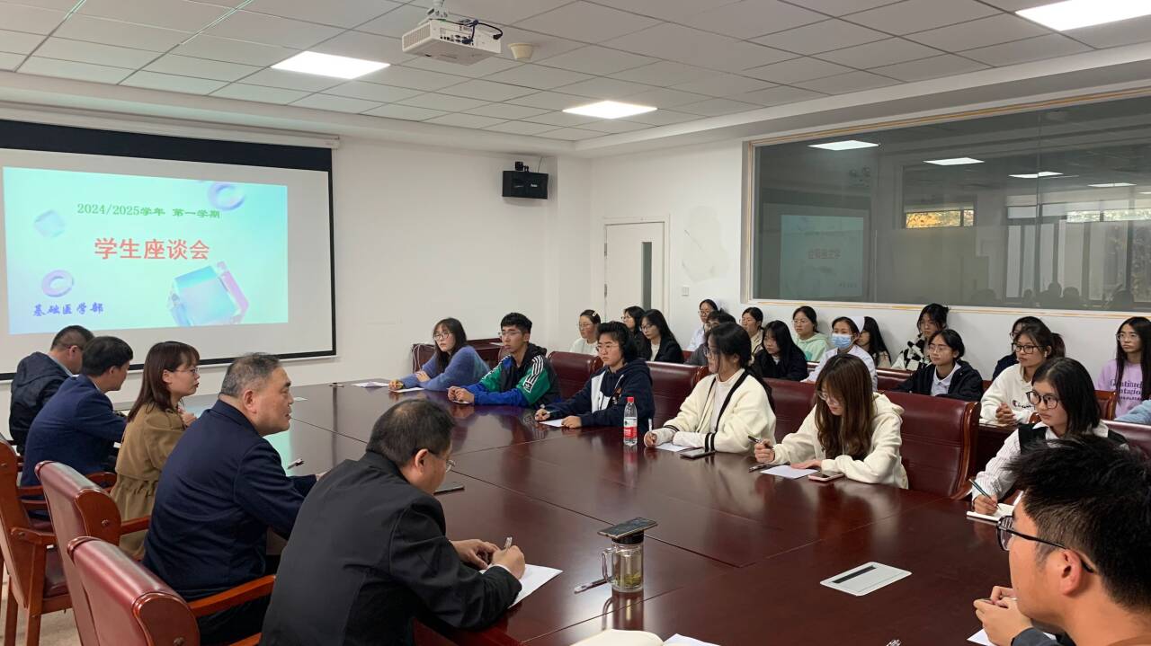 为了解学生医学基础课程学习情况,提升部门教育教学质量,11月14日下午,基础医学部在1号实训楼213会议室召开2024/2025学年第一学期学生座谈会。基础医学部党总支副书记杨铤、副主任陈培、解剖生理教研室主任王士珍、病理教研室主任林波、质控专员周讯及相关班级学生代表参加了座谈会,会议由周讯老师主持。
