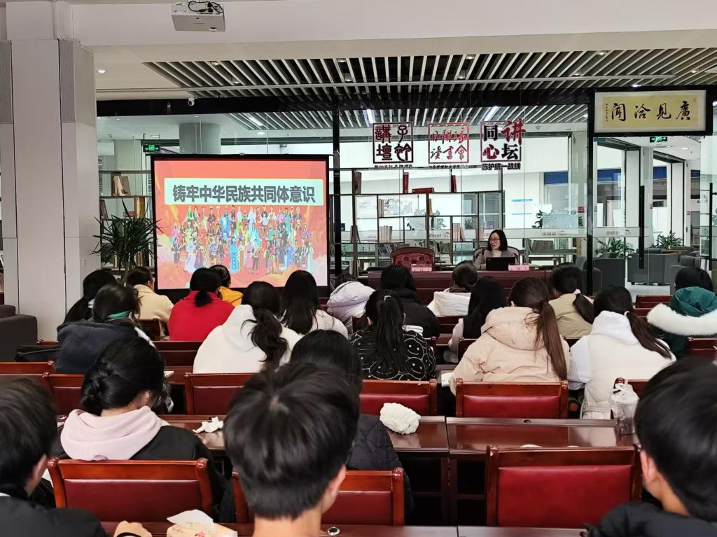 为将铸牢中华民族共同体意识融入办学治校、教书育人全过程,有形有感有效开展铸牢中华民族共同体意识教育,12月3日,beat365铸牢中华民族共同体意识宣讲团在图书馆楼“同心讲坛”开讲。beat365马克思主义学院周亚老师作题为《铸牢中华民族共同体意识》的授课,24护理学班全体学生聆听了宣讲。