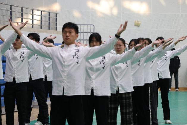 体育馆内,同学们的动作整齐划一、优美流畅,他们四肢舒缓伸展结合呼吸一吐一纳,每一个动作都蕴含着六字诀功法的精髓。