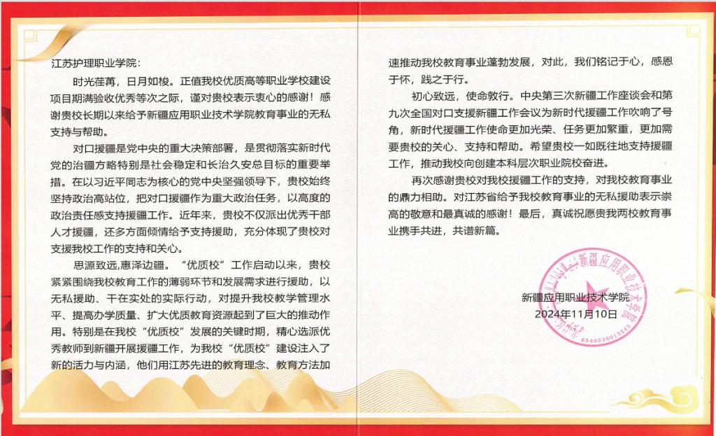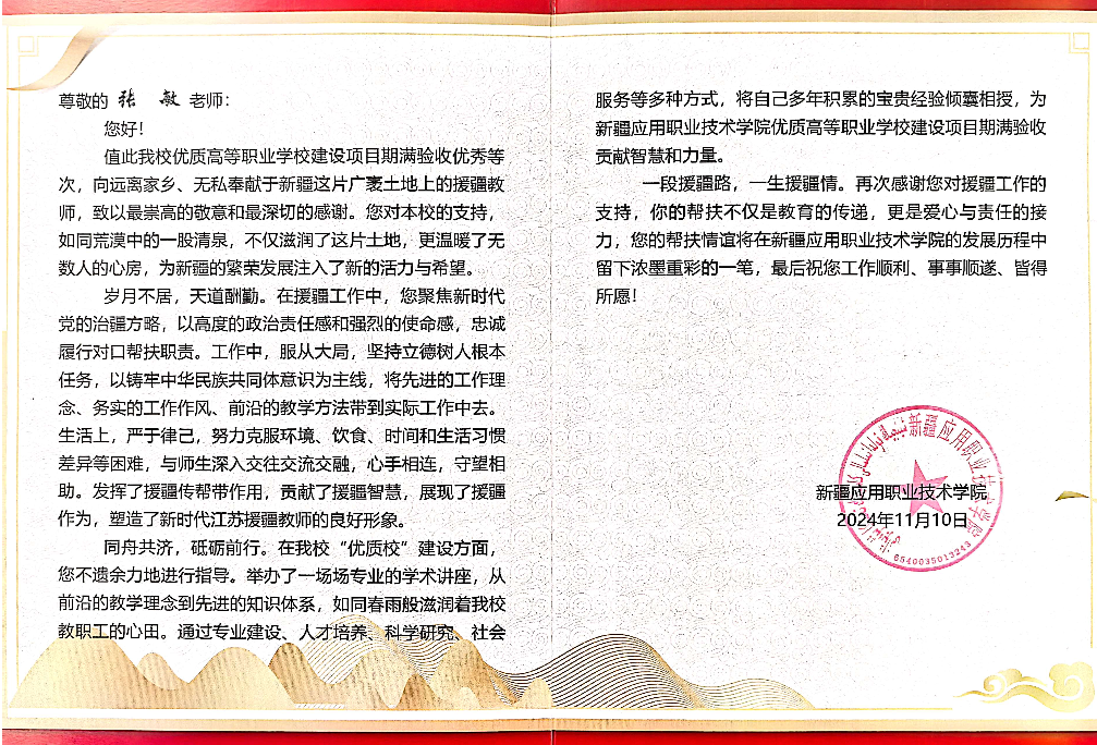 近日,学校收到两封来自新疆应用职业技术学院的感谢信,以表达对beat365援疆工作及援疆教师的感谢。这两封信不仅承载着新疆应用职业技术学院对beat365教育帮扶工作的诚挚谢意,更见证了两校间坚固的情谊。