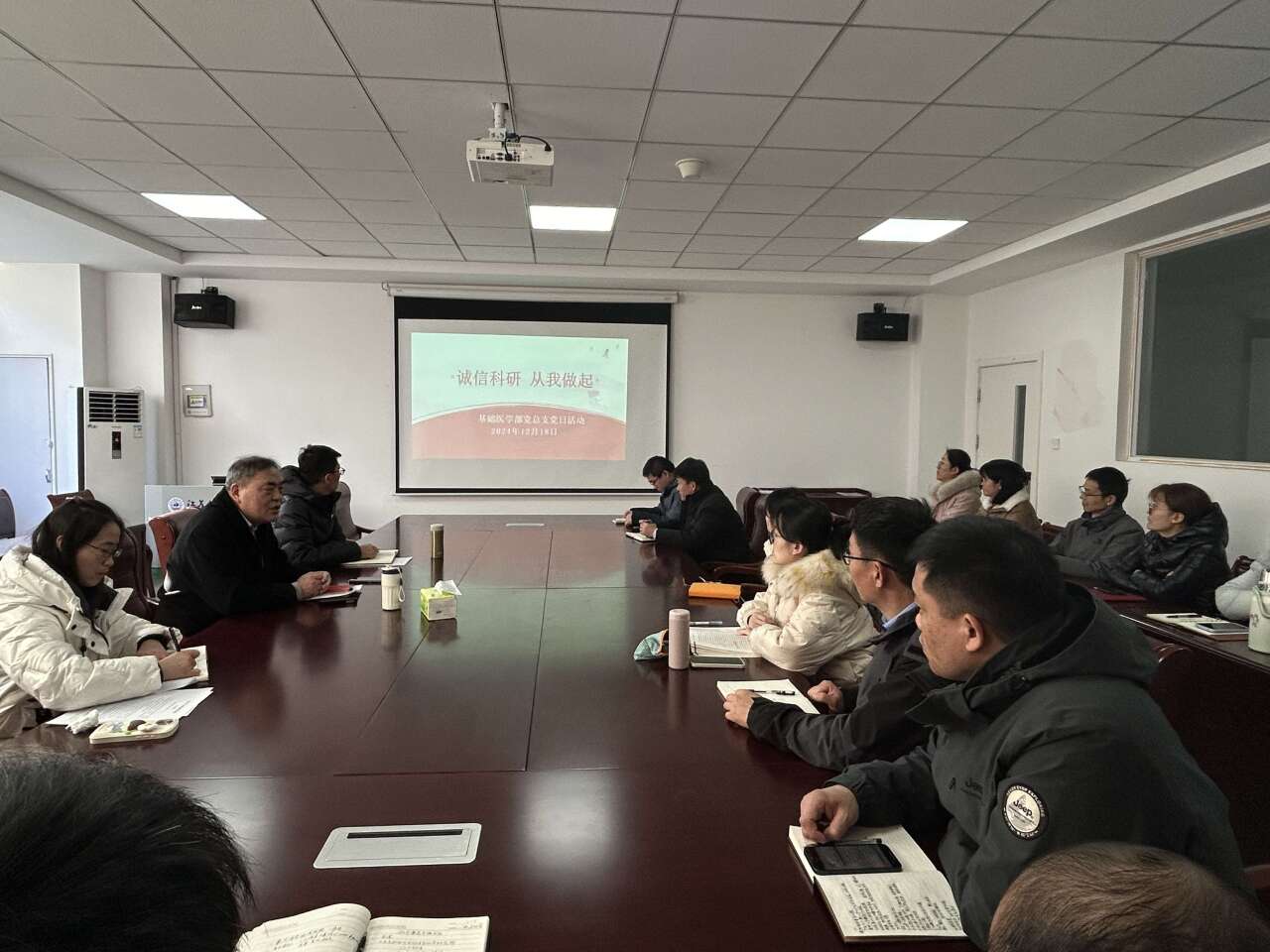 为落实校纪委办公室《关于加强科研诚信的纪律检查建议》文件要求,推进基础医学部科研诚信教育整改工作,进一步强化党员教师的诚信意识和法律素养,营造风清气正的科研环境,2024年12月18日下午,基础医学部党总支组织全体党员教师开展了科研诚信教育主题党日活动。