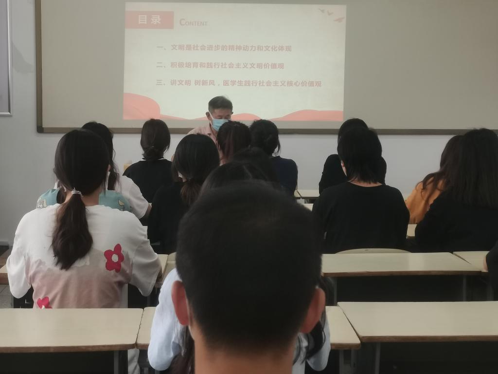 周凤山从“文明是社会进步的精神动力和文化体现”“积极培育和践行社会主义文明价值观”“讲文明,树新风,医学生践行社会主义核心价值观”三个方面对文明进行了深入的讲解。周凤山强调:作为一名大学生,更应认真贯彻、践行社会主义核心价值观。周凤山强调:我们大学生是祖国的未来,是民族的希望,身上肩负着振兴中华民族的历史使命,代表着新潮流的发展,几千年文明的传承者和接班人,需加强自身个人修养,加强精神文明建设,弘扬中华传统美德。