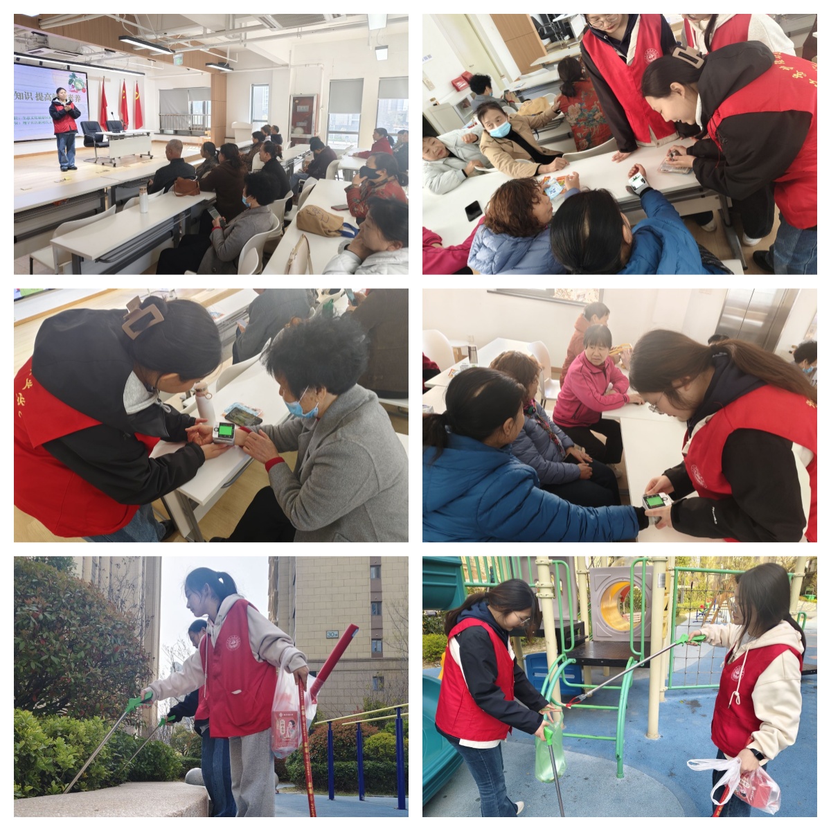下午1点30分,志愿者们提前抵达社区,有条不紊地完成场地布置。简短的动员后,大家迅速进入状态,分组开展工作。一组志愿者在社区活动室开展春季传染病防控健康讲座。他们用贴近生活的语言,向居民普及春季传染病的防治知识,并针对老年慢性病管理,给出实用的建议。现场互动热烈,居民们踊跃提问。讲座结束后,另一组志愿者立即开展爱心义诊。他们耐心地为老年人测量血压,仔细询问健康状况,还为居民发放暖宝贴、降热贴,反复叮嘱日常防护注意事项。与此同时,部分志愿者深入社区,帮助清扫公共区域的卫生,营造干净整洁的居住环境。