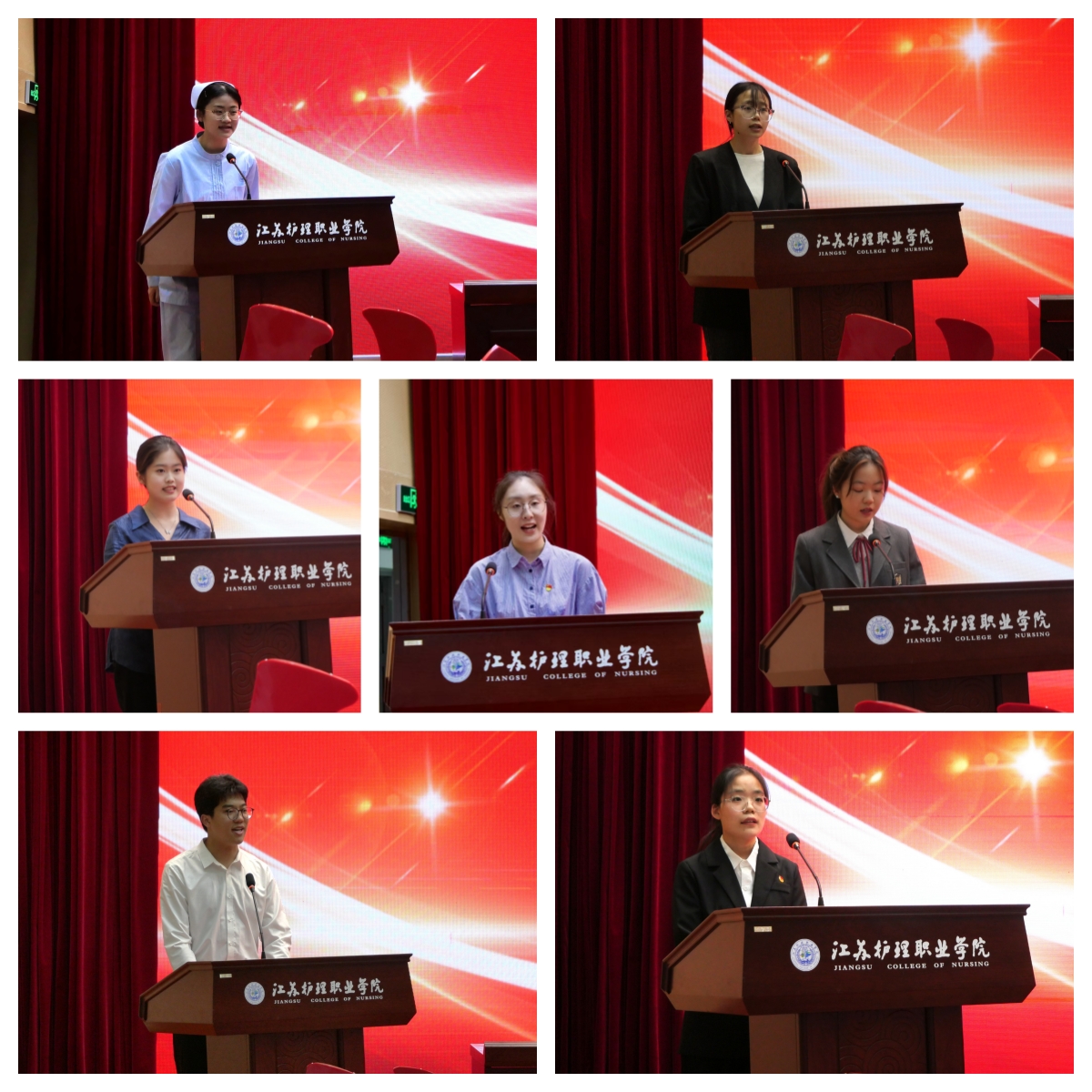 在“我的青春故事报告会”环节,七位来自不同学院、不同领域的优秀青年代表依次分享了他们的奋斗历程和成长感悟。护理助产学院韩昕瑶荣获2025年江苏省职业院校技能大赛“高职医药卫生赛道四”护理技能赛项一等奖,她讲述了在备赛过程中无数次重复操作、精益求精的故事;医学技术学院丁静凭借2025年江苏省职业院校技能大赛“高职医药卫生赛道三”检验检疫技术项目一等奖的佳绩,分享了自己对专业的热爱与钻研;康复学院叶雨晗以2024年“领航杯”江苏省大学生数字素养与技能大赛高职组一等奖的经历,展现了在传承与创新中的大医精诚;中医药学院王奕予分享了在2024年江苏青年创青春大赛斩获一等奖背后的团队协作与不懈努力;护理助产学院鲍雅洁讲述了2024年江苏省高校红十字会“博爱青春”暑期志愿服务项目金奖背后的暖心故事与责任担当;2024届毕业生高明宇作为江苏省“乡村振兴计划”志愿者代表,分享了投身基层、服务乡村的感人经历;校学生会李赵琳则围绕“全心全意为同学服务”,讲述了学生会成员在幕后默默付出、助力同学成长的点滴。他们用真挚的语言、生动的事例,展现了苏护青年的责任与担当,赢得了现场阵阵掌声。