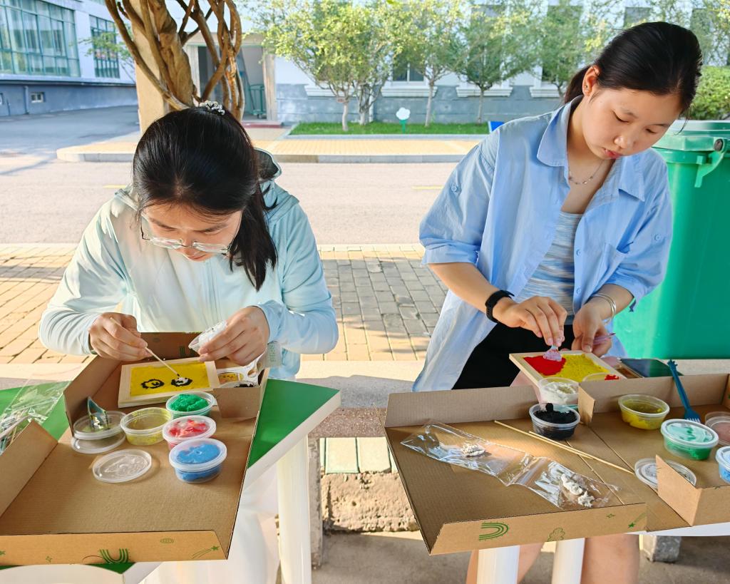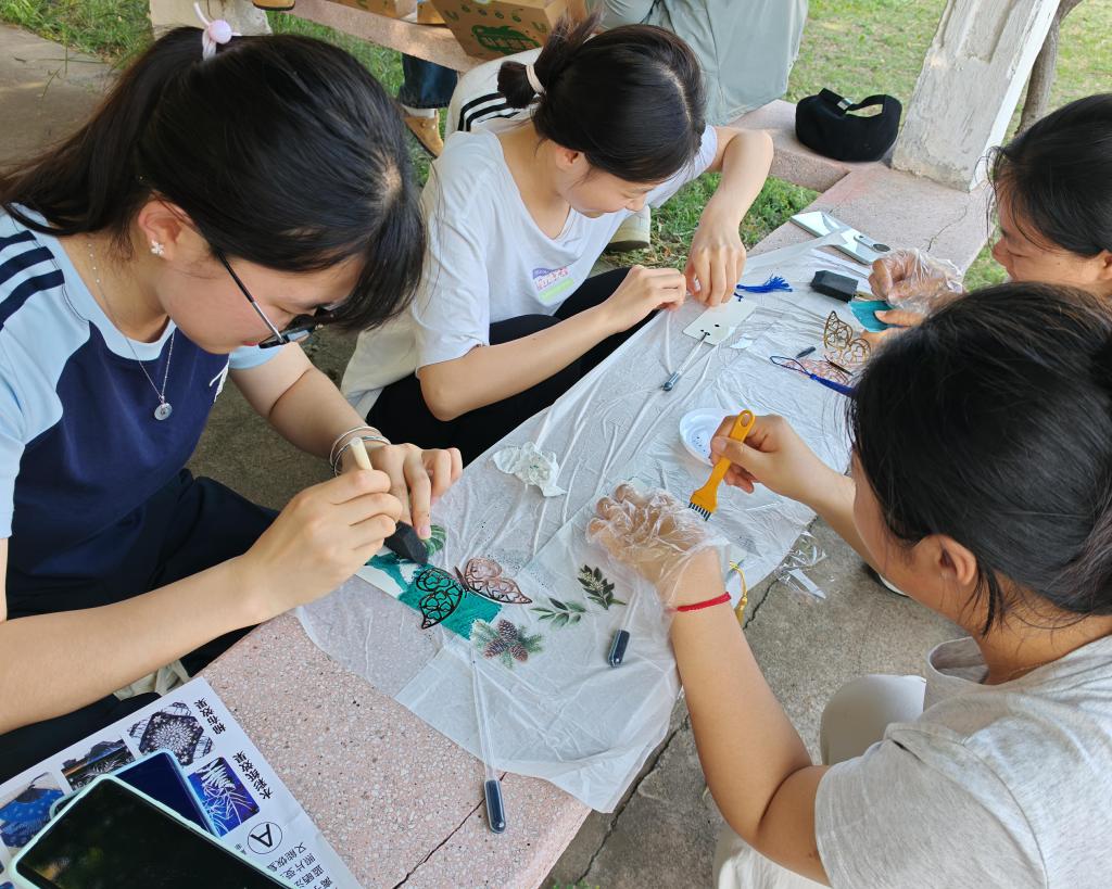 心理市集上同学们可以参与端午编绳、蓝晒制作、传统纸浆画和端午香包制作活动。在端午编绳区,同学们用五彩丝线编织手链,既体验了传统手艺,也为生活增添了一份美好期许。蓝晒制作区,大家用天然染料在纸上创作出独特的蓝色图案,感受传统工艺的魅力。纸浆画活动则鼓励同学们变废为宝,用废旧纸张和白胶制作出创意画作,既环保又有趣。最受欢迎的端午香包制作中,同学们亲手调配药材填充香包,淡淡药香让人身心放松。现场气氛轻松,同学们在动手实践中释放压力,通过交流互动拉近了彼此距离。一位参与活动的同学表示:“做手工时特别解压,烦恼好像都暂时消失了。”