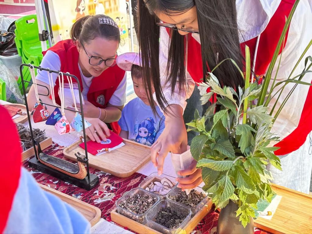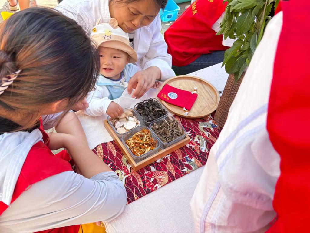 活动现场,志愿者精心布置了“中药认知互动区”,将艾叶、藿香、紫苏等十余味中药材以“看、闻、触”依次展示,通过趣味问答、实物触摸等方式,向家长和孩子们讲解药材特性:“艾叶晒干后香气浓郁,能驱赶蚊虫;薄荷清凉提神,还可以缓解头痛。”在“巧手制香囊”制作环节,家长和小朋友们在志愿者的指导下,将药材装进精美的香囊袋,看着散发着淡淡药香的香囊在手中成型,孩子们爱不释手。此外,志愿者还现场演示海姆立克急救法,分享食疗养生的中医育儿理念,将健康知识与节日氛围巧妙融合。