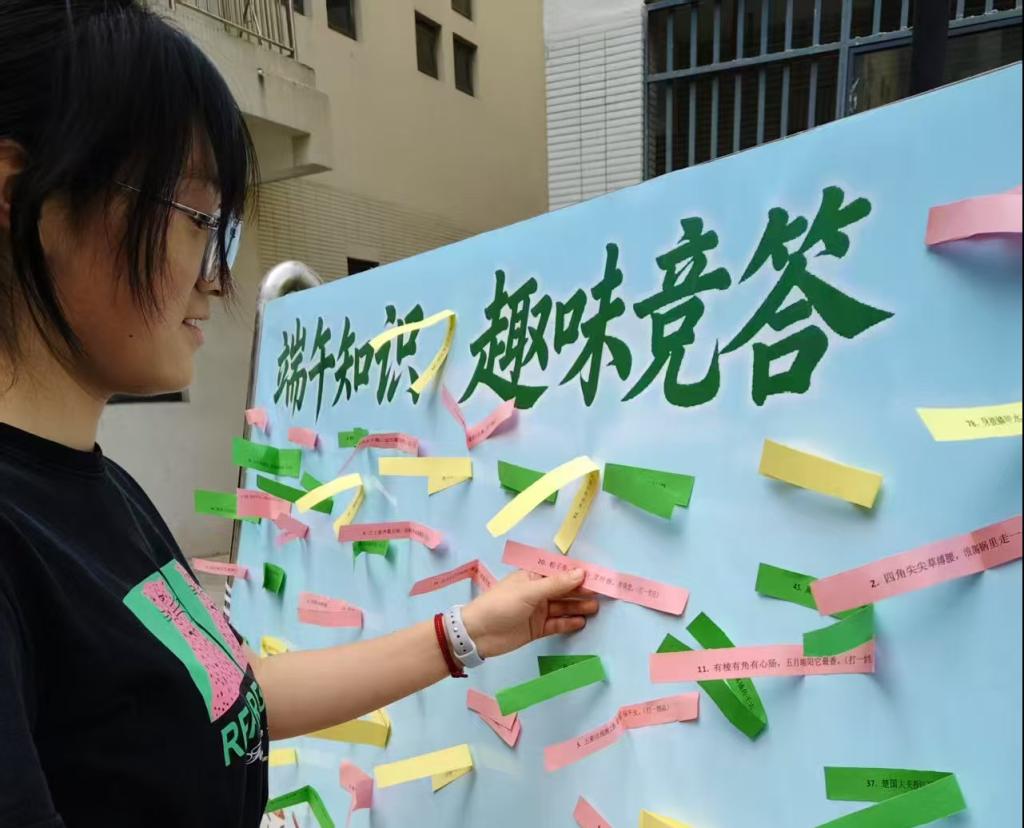 活动以“端午节知识趣味竞答”拉开帷幕,题目内容精心设计,既涵盖端午节起源、习俗等传统文化知识,又融入校园权益相关常识。参与同学随机抽取题目卡片,在30秒内作答,答对者可获龙舟主题书签或香囊。这一环节不仅考验学生对传统文化的认知,更通过“权益知识嵌入”的方式,让抽象的权益理念以趣味化形式深入人心,推动学生在互动中深化对“优秀传统文化传承”与“自身权益维护”的双重理解。