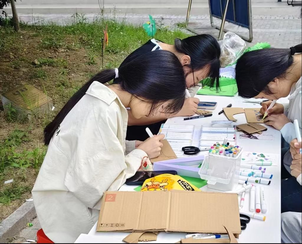 在“龙舟手工DIY大赛”中,学生以个人或 2-4 人小组为单位,利用废旧纸箱、塑料瓶等材料制作迷你龙舟模型。24护理10班张梓萌同学的团队围在工作台前,一边用彩纸装饰废旧瓶身,一边兴奋地讨论:“我们给龙舟装个可滑动的‘船桨’吧!这样既体现传统元素,又能展示环保创意”。“端午清风,手绘芳华”团扇制作环节则充满文化艺术氛围。同学们挥动画笔,将传统文化符号与权益理念巧妙结合,在动手实践中感受节日氛围与权益守护的双重意义。24护理12班马印儿同学表示:“手工制作权益主题团扇很有意思,既学会了手工制作,又记住了权益知识,感觉自己参与了一次特别的文化创作。”