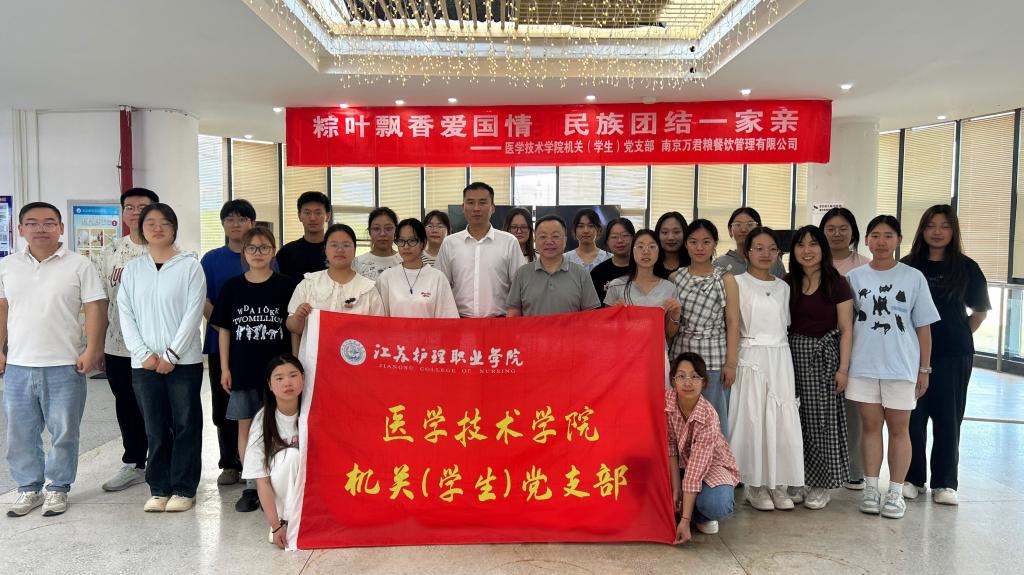 为传承中华优秀传统文化,深化民族团结进步教育,厚植师生爱国主义情怀,5月29日下午,医学技术学院机关(学生)党支部、团总支、“一站式”学生社区、南京万君粮餐饮管理有限公司在科技路校区二楼餐厅共同举办了“粽叶飘香爱国情 民族团结一家亲”主题党日活动。校党委委员、副院长史亚明、医学技术学院机关(学生)党支部全体党员、少数民族同学代表、班级学生代表参与本次活动。
