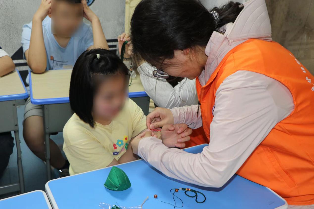 志愿者通过趣味动画与生动故事,为孩子们讲述端午节的起源与习俗,帮助他们感受传统文化魅力。在DIY粽子手工环节,孩子们在志愿者手把手指导下,用彩纸、棉花制作出一个个可爱的“小粽子”。活动最后,微米志愿者们为孩子们系上象征健康平安的五彩绳。