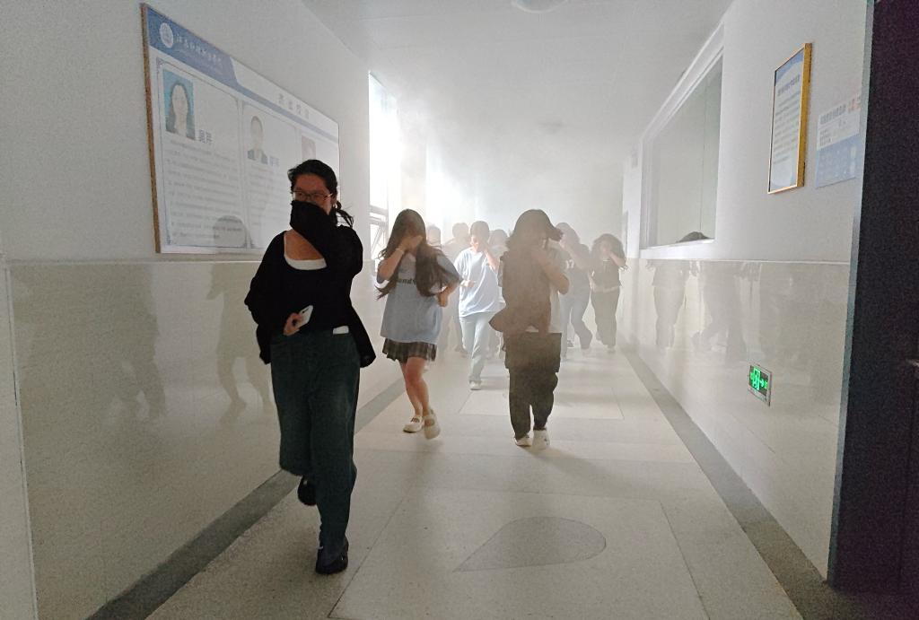 随后,学院在实训2号楼组织开展了疏散逃生演练。随着警报声的响起,演练正式开始。全体师生按照预先制定的疏散方案,迅速、有序地从各楼层向安全区域疏散。在演练过程中,各岗位负责教师坚守职责,引导学生规范逃生,避免拥挤、踩踏等情况发生。全体师生仅用短短几分钟便完成了疏散,到达指定安全地点,整个演练过程紧张有序、衔接顺畅,达到了预期的演练效果。