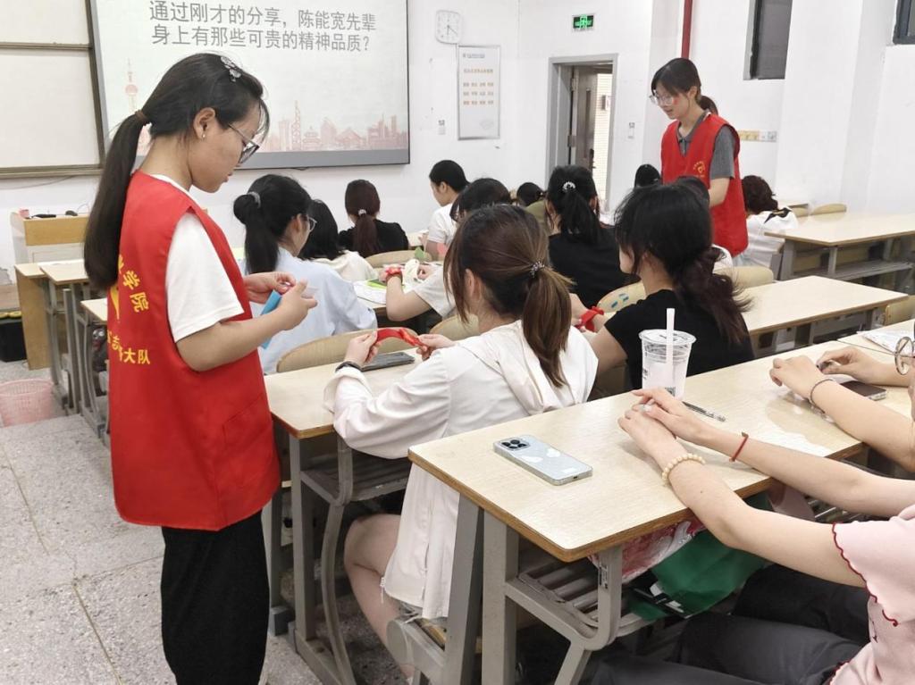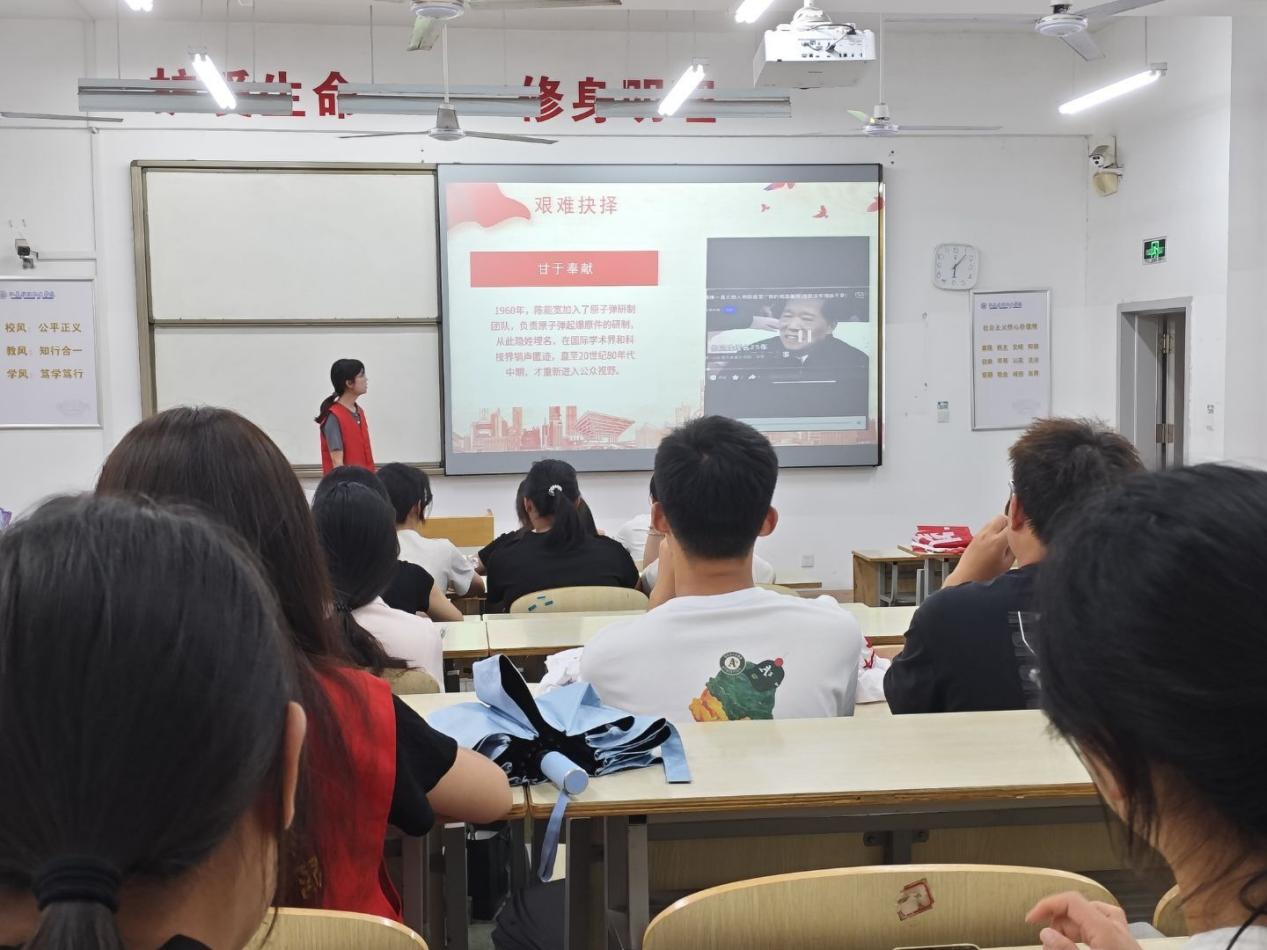 活动采用“理论宣讲+情景体验”的沉浸式教育模式。现场,志愿者们围绕“两弹一星”元勋陈能宽事迹展开宣讲,通过问答互动引导同学们领悟其无私奉献、爱国情怀和钻研精神。同时,借助红色剧本杀与小纸片书写环节,同学们扮演科研工作者,亲身感受突破技术封锁的艰辛过程,在沉浸式环境中感受老一辈科学家的奋斗历程,优秀参与者获赠爱国手环奖励,以此激发对“两弹一星”精神的深入思考。