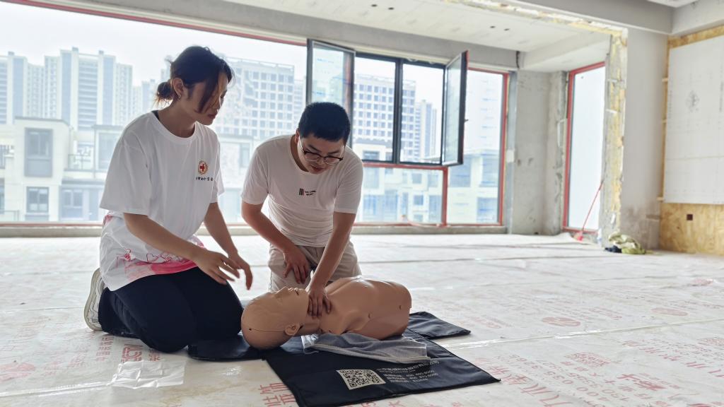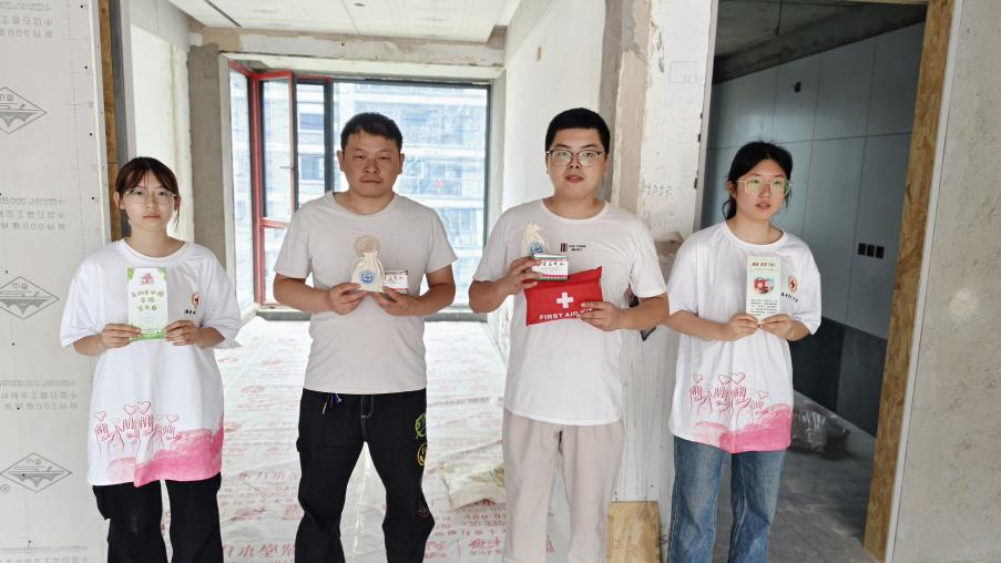 7月1日,中医药学院“急救手中握,幸福常左右”——“博爱青春”大学生暑期志愿服务项目志愿者走进居民新房装修现场,面向房屋装修工人开展急救知识科普活动,并送上暖心物资,用实际行动传递关怀与温暖。