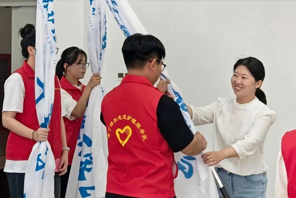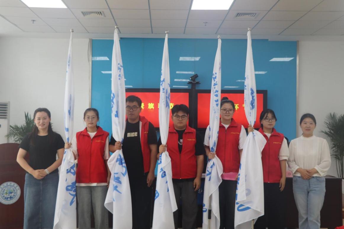 出征仪式上,全体志愿者共同宣誓,陈颖、朱敏为省级、市级及校级立项团队授旗。