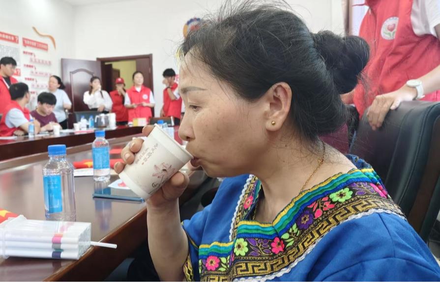 产教融合:茶香传递健康关怀。活动中,守护团带来了学校产教融合的特色成果——江苏省非物质文化遗产韩达哉养生茶。志愿者热情地为现场群众献上温润的茶饮,并介绍健康功效。茶香袅袅中,大家品尝健康的滋味,更切身感受到高校服务地方实践成果,现场氛围温馨融洽。