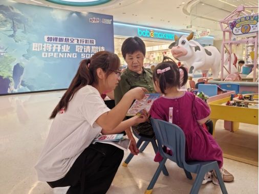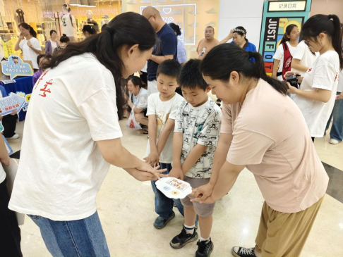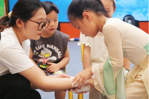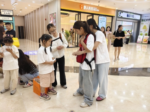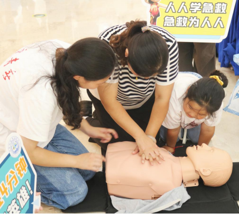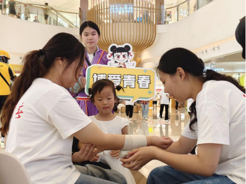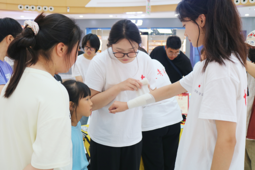 童趣教学,急救启蒙。“哪吒哪吒,有人流血了怎么办?”在华信Mall购物中心、金地Mall,化身热门电影角色哪吒、敖丙的志愿者,瞬间吸引了众多孩子的目光。他们巧妙地将拨打急救电话、处理简单外伤等基本急救技能融入角色互动和生动示范,让孩子们在轻松愉快的氛围中掌握初步的自救互救本领。新颖的形式令家长们赞不绝口:“孩子们学得又快又好,这种寓教于乐的方式太有效了!”