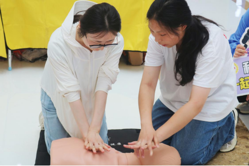 实战演练,精准施救。面对中青年群体,融创和水渡口万达广场内上演了紧张的心肺复苏实战演练。志愿者利用携带的智能人体模型,真实模拟心脏骤停的紧急场景。市民们在专业指导下进行胸外按压,模型实时反馈按压深度与频率的精确数据,让每一位参与者都能直观感知施救动作的规范性与有效性。一位刚完成演练的年轻市民感慨道:“以前总觉得急救是专业人士的事,亲手练过才知道,关键时刻的‘黄金四分钟’,我们普通人也能把握住!”