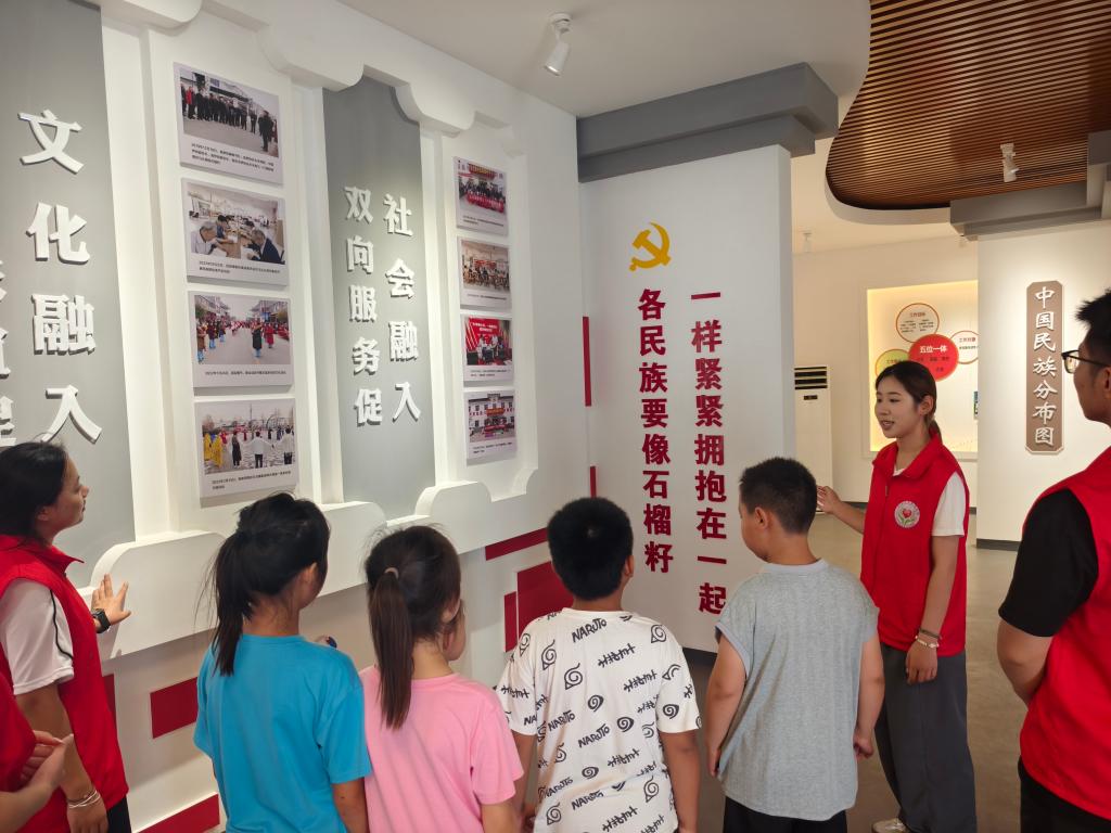 薪火相传:共话乡村振兴新篇章。在马头镇张庄镇村红石榴家园,志愿者带领孩子们参观学习党的民族政策。墙上“各民族像石榴籽一样紧紧抱在一起”的标语醒目鲜明,志愿者以童趣化语言结合展板图文故事,向孩子们系统讲解各民族平等、团结、互助、和谐的深刻内涵,阐释党的民族政策如何如阳光雨露般滋养各民族共同成长。在“石榴抱籽”互动游戏中,孩子们与志愿者手拉手围成圆圈,象征各民族紧密相连,“铸牢中华民族共同体意识”的理念在欢声笑语中融入每个人心田。