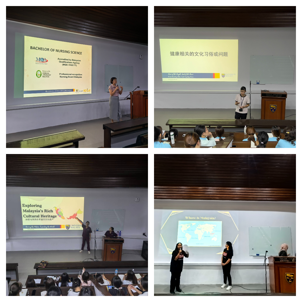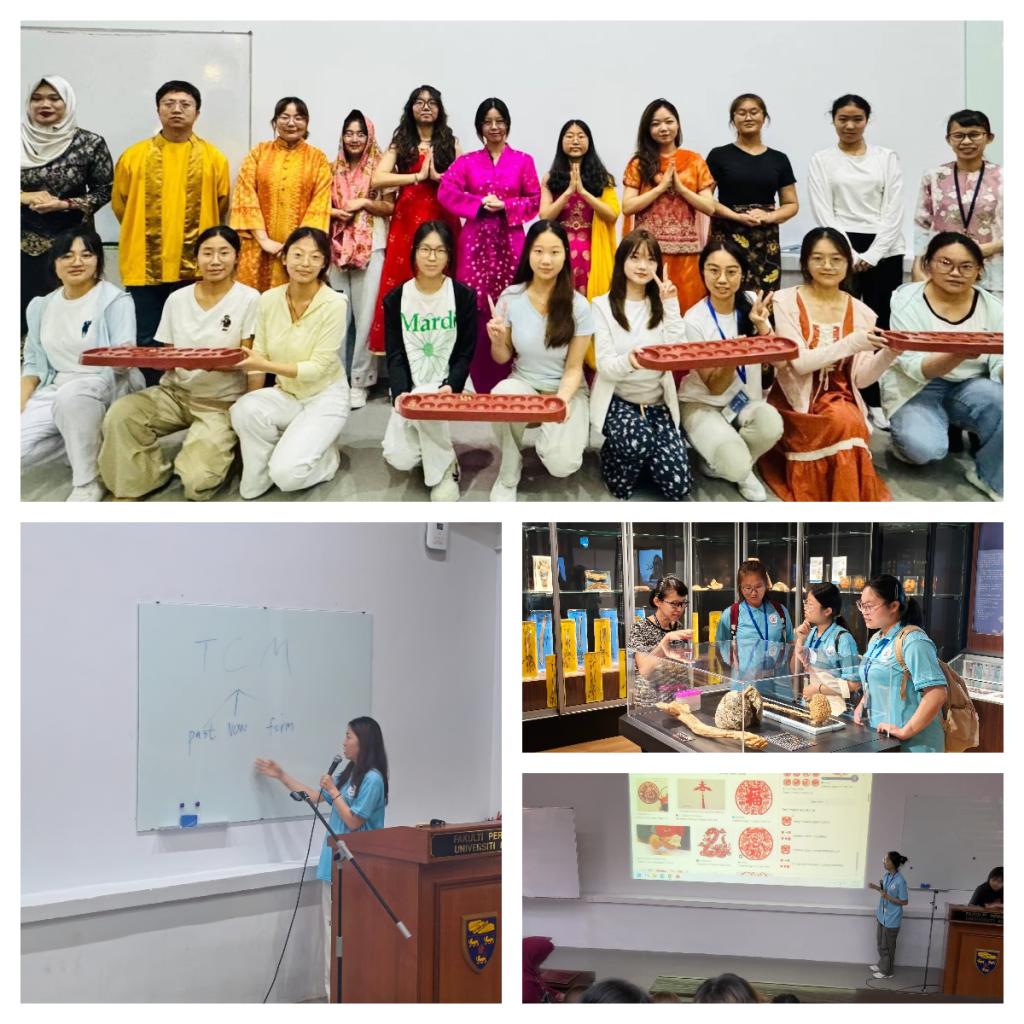 研学期间,学员们依次参与了形式多样的课程,展现了极高的热情与积极性。在专业课程学习和交流活动中,护理系本科教学负责人Dr Che Chong Chin向学员们详细介绍了马来亚大学护理专业本科申请方式和教学安排。来自24护理合作办学2班的陆怡文同学表示 :“通过了解马来亚大学护理专业教学模式,为我未来海外留学指明了努力方向,希望将来能在此就读深造。”在马来西亚文化和民俗体验课程上,学员们在情境模拟中了解了马来西亚“多元共生”的族群文化以及健康管理的行为实践,体验了马来西亚的民族服饰和传统风俗,学习了马来西亚语实用表达,同时以中医药文化为纽带向马来亚大学师生介绍了中国传统文化,以文化交融为核心,学员们既是学习者也是传播者,促进了中马文化交流互鉴。