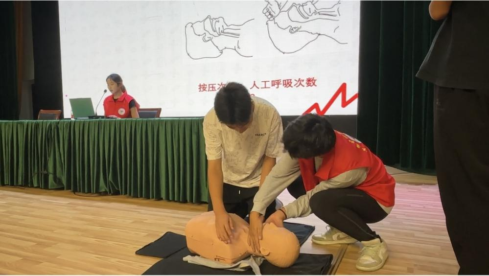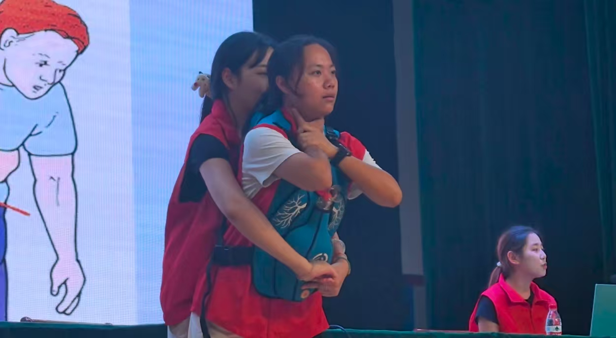 开展海姆立克急救法培训。在急救技能培训环节,志愿者首先介绍了海姆立克急救法的适用情境与操作规范。随后邀请多名同学上台,分别模拟“施救者”与“被救者”进行实操演练。台上操作严谨规范,台下观摩专注认真,整体互动积极,反响良好。