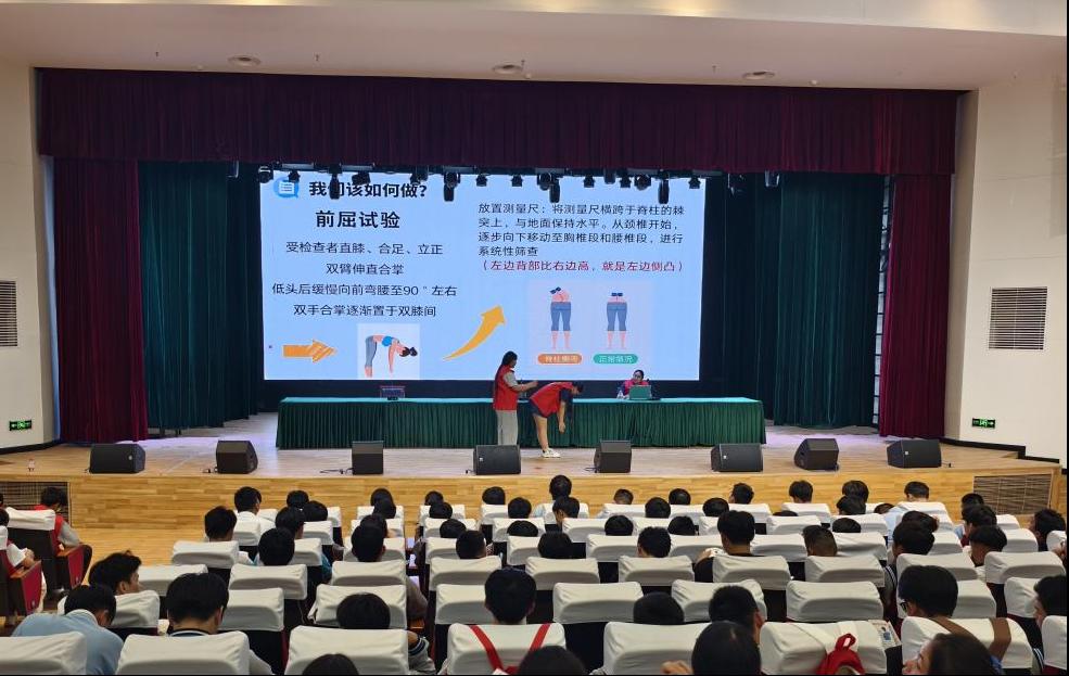 开展脊柱健康筛查与保健操学习。活动现场,志愿者演示了脊柱测量尺的使用方法与筛查标准,讲解日常体态对脊柱健康的影响,并带领全体同学学习专为青少年编排的“脊柱健康操”。同学们两人一组互相进行体态观察与测量,认真练习健康操动作,现场气氛热烈。大家在实践中掌握了脊柱健康的自查与日常保健方法,纷纷表示将在今后的学习和生活中端正姿势、加强科学锻炼,以实际行动关爱脊柱健康。