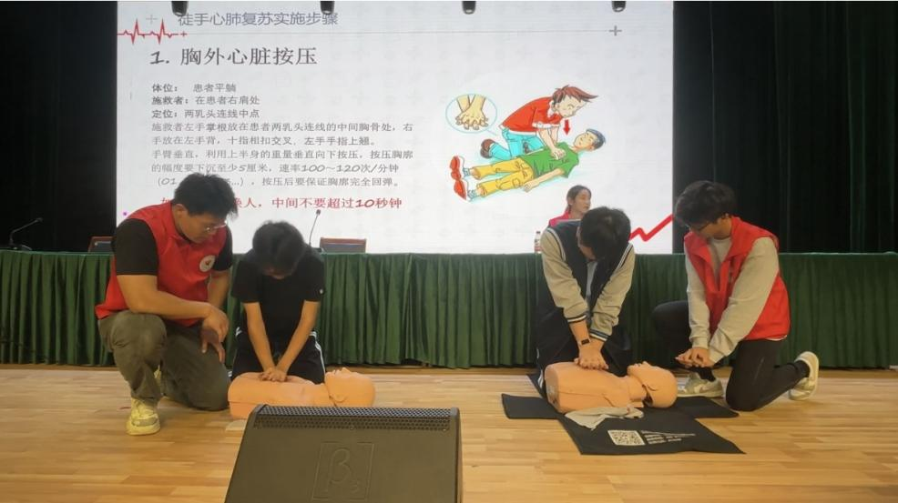 开展心肺复苏(CPR)演练。志愿者借助专业人体模型,详细演示了胸外按压、开放气道、人工呼吸等标准化操作流程。同学们对此兴趣浓厚,踊跃参与,在“手臂要伸直,按压要有力”等一对一指导下,依次进行实操演练。在模拟真实急救场景下,参与者不仅初步掌握了CPR的关键技能,也更加深刻地认识到“黄金四分钟”在生命救援中的关键意义。
